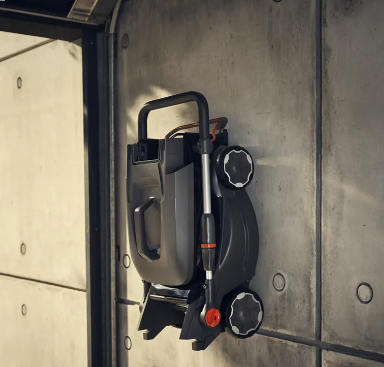 Questo tagliaerba a batteria Husqvarna Aspire™ LC34-P4A da 18V è facile da usare, riporre e trasportare. Progettato per adattarsi a spazi ridotti, si ripiega in modo da essere riposto in verticale sul pavimento o a parete tramite il gancio su misura incluso e grazie al cesto di raccolta staccabile.